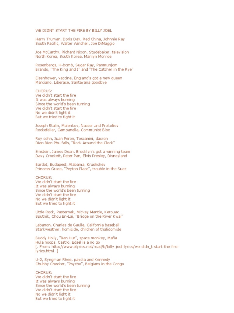 Billy Joel We Didn T Start The Fire Lyrics We Didnt Start The Fire By Billy Joel Harry Truman Doris Day Red China Johnnie Ray South Pacific Walter Course Hero