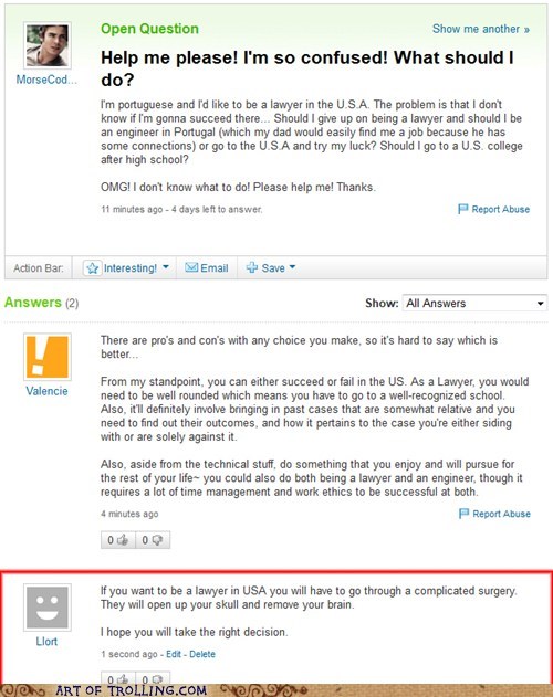 Yahoo Answers Lawyer In The Usa Art Of Trolling Troll Trolling Yahoo Answers Omegle